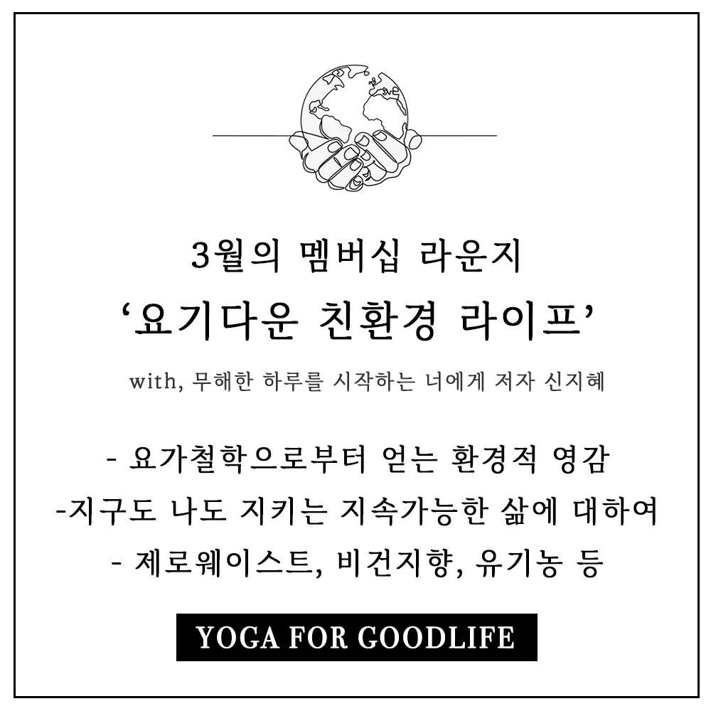3월 멤버스 라운지, 요기다운 친환경 라이프 3월의 멤버십 라운지는 <요기다운 친환경 라이프> 라는 주제로 소통하는 시간을 가져봤습니다!평소 환경문제에 관심이 있던 분들, 실천 중이거나 실천하고싶은데 무엇부터 하면 좋을지고민이셨던 분들과 함께 일상에서 실천할 수 있는 친환경 방법에 대해 소통해봤습니다!